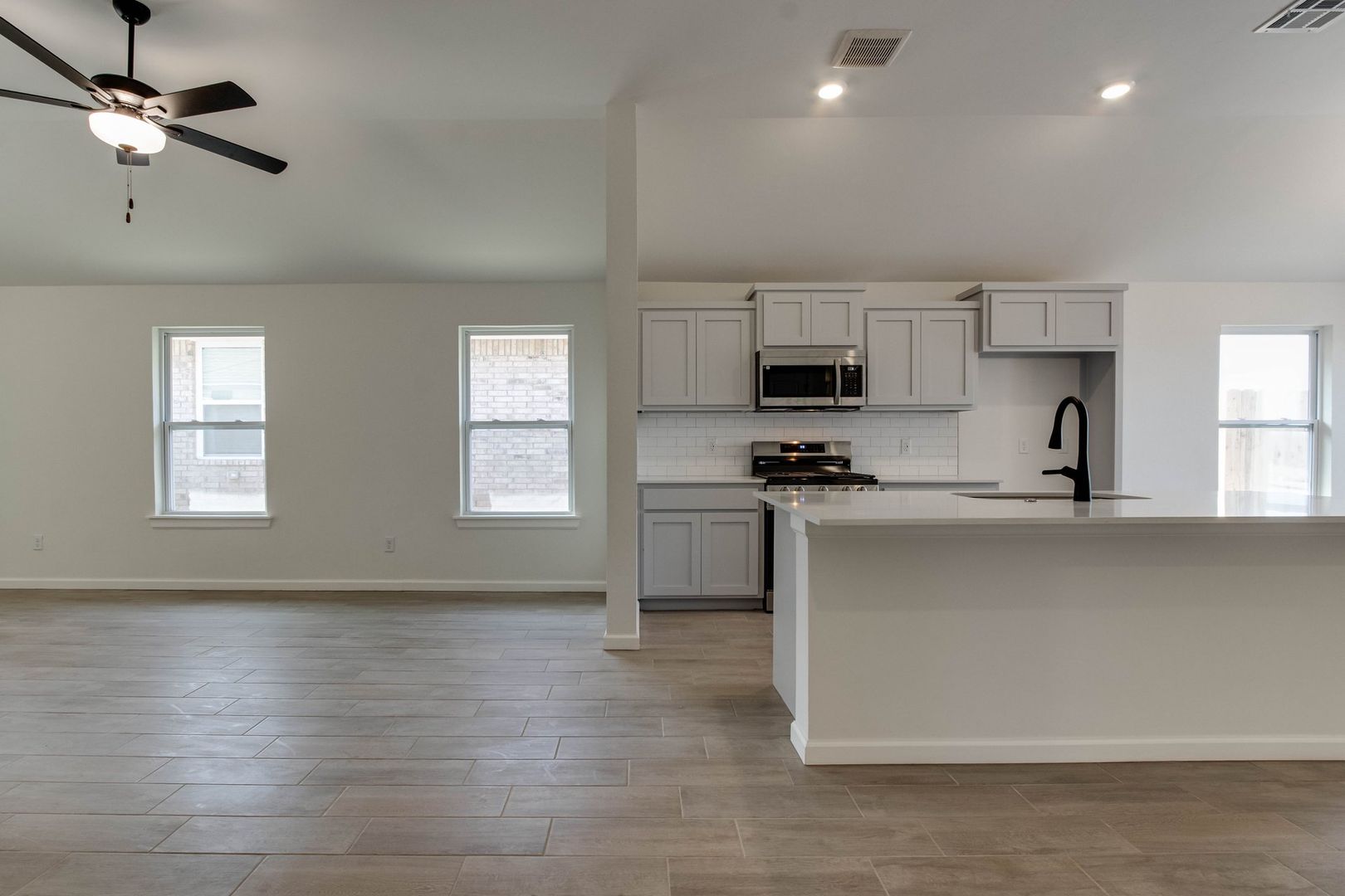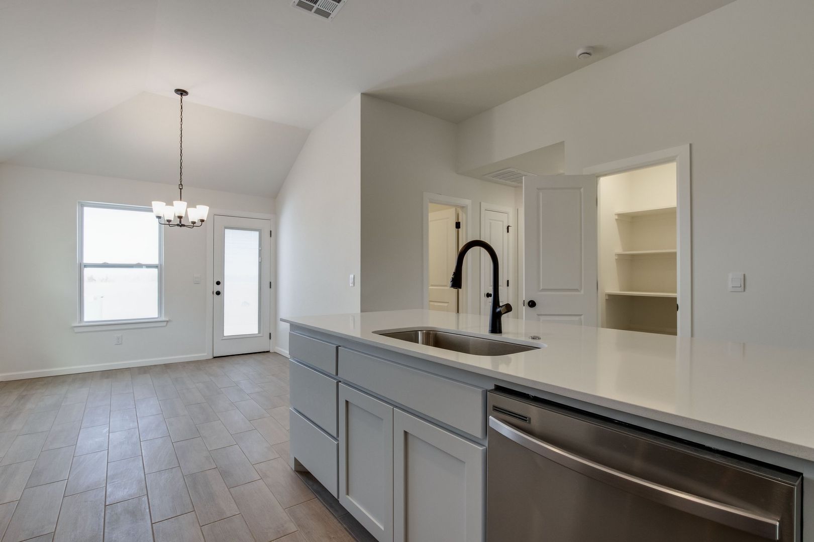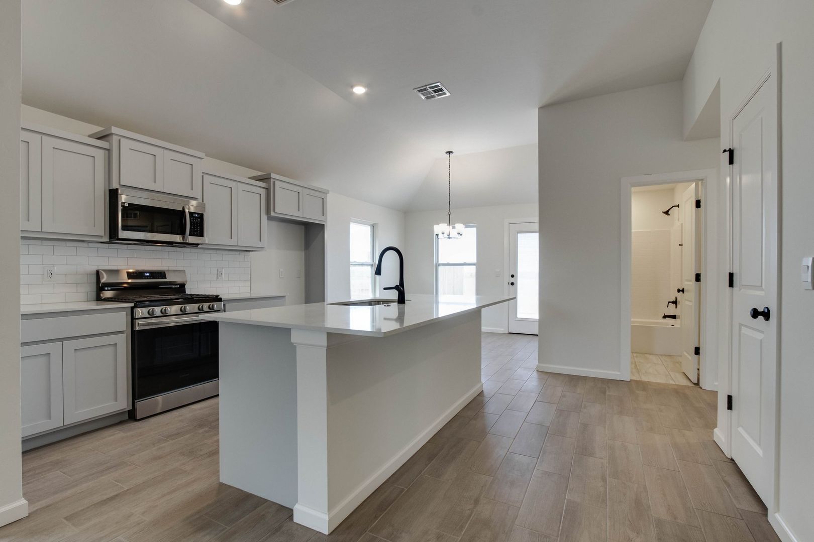 - Quartz countertops + large island