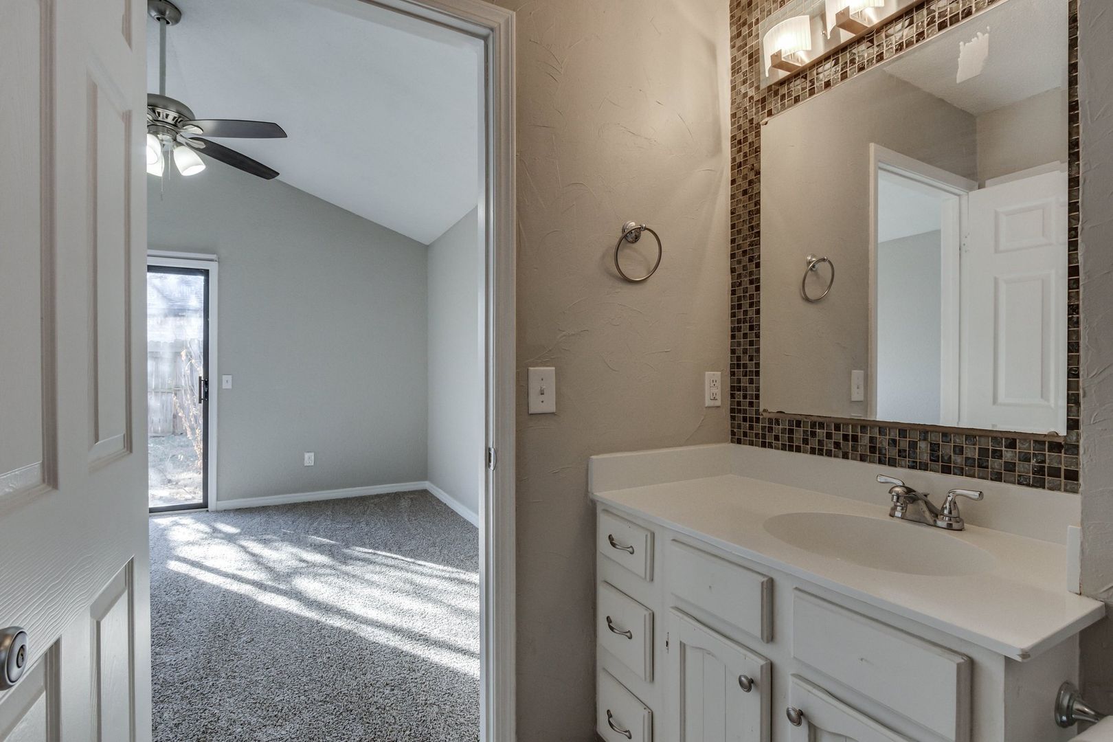 The split-bedroom layout provides privacy and flexibility, with spacious bedrooms, plush carpet, ceiling fans, and excellent closet storage throughout. The primary suite includes a private bathroom and direct access to the backyard, making it a peaceful retreat at the end of the day.